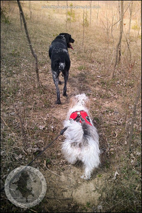 and of course, no blog entry would be complete without an appearance by the resident scruffies … matea and merrick goobernuts out for a hike (taken with my not-so-great Blackberry) …