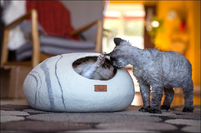 The thing is, I put a monumental amount of thinking and research into the decision to bring a second cat into my home for Mirabelle. After Mirabelle lost her one feline friend, it was clear Mirabelle was lonely. I saw the cats of other Rex guardians … sleeping and grooming and playing with one another. I longed for a relationship like that for Mirabelle again. From all of my research and digging, I knew that the best fit for Mirabelle was another Rex (they really are unique and quirky cats).